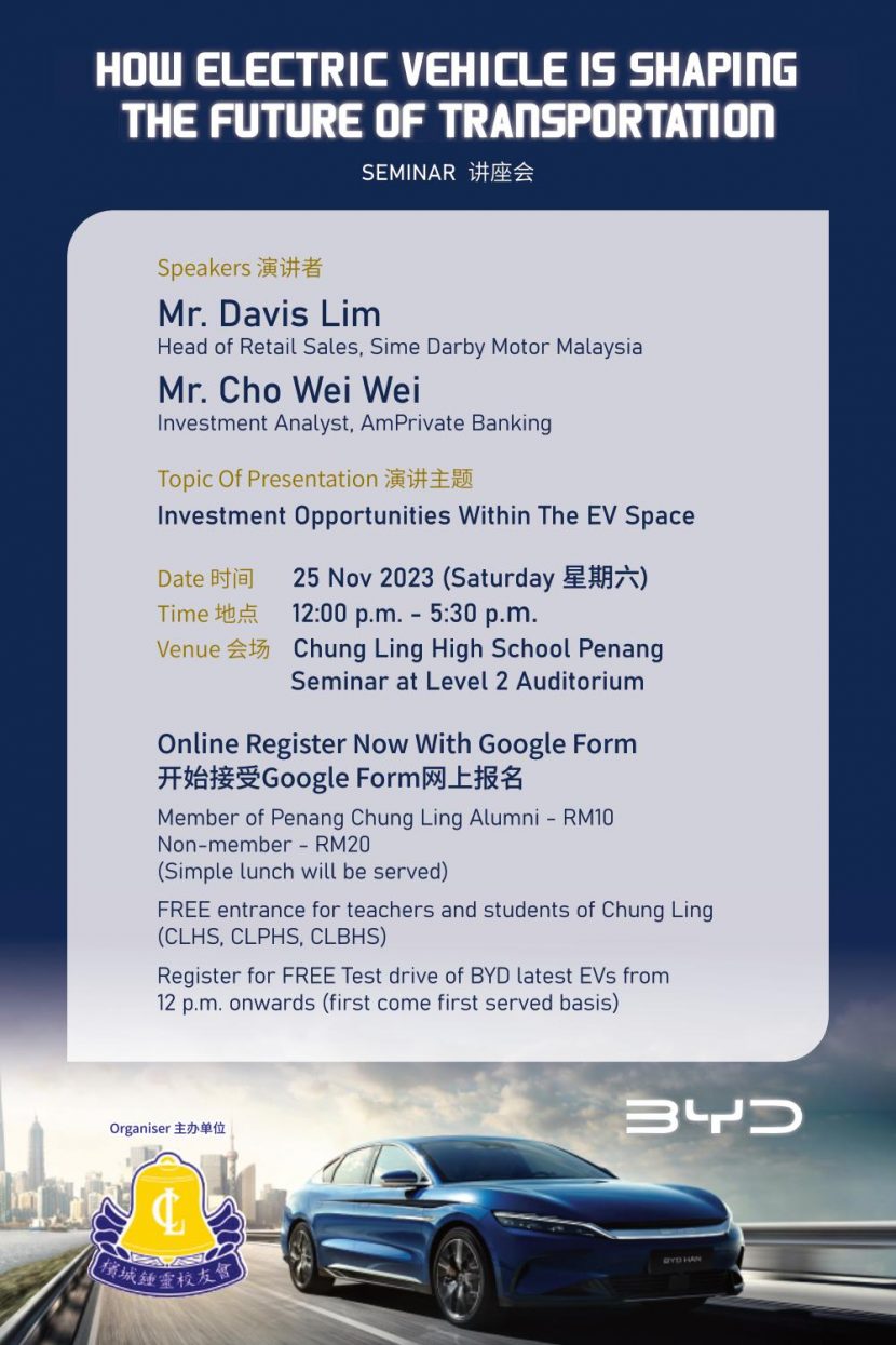 槟城锺灵校友会将于11月25日举办BYD讲座会以提升校友们在电动汽车方面的知识及促进彼此之间的交流,详情及流程如下。